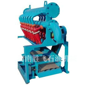 當具有一定壓力(0.2-0.45MPa)的鉆井液通過進口管匯,沿旋流器內壁切向進入旋流器圓筒體并高速向下螺旋旋轉時,產生了巨大的離心力場,大量的輕質鉆井液由中心的低壓區螺旋上升,從溢流口排入鉆井液循環罐中,鉆井液中較重的固相顆粒在離心力的作用下被甩向街壁,并在鉆井液向下旋轉的推力和自重作用下沿旋流器內壁螺旋下沉,從底流口排出并流至篩面,經過振動篩的端分,少量鉆井液與團相顆粒得到分離,從而起到凈化鉆井液的作用。